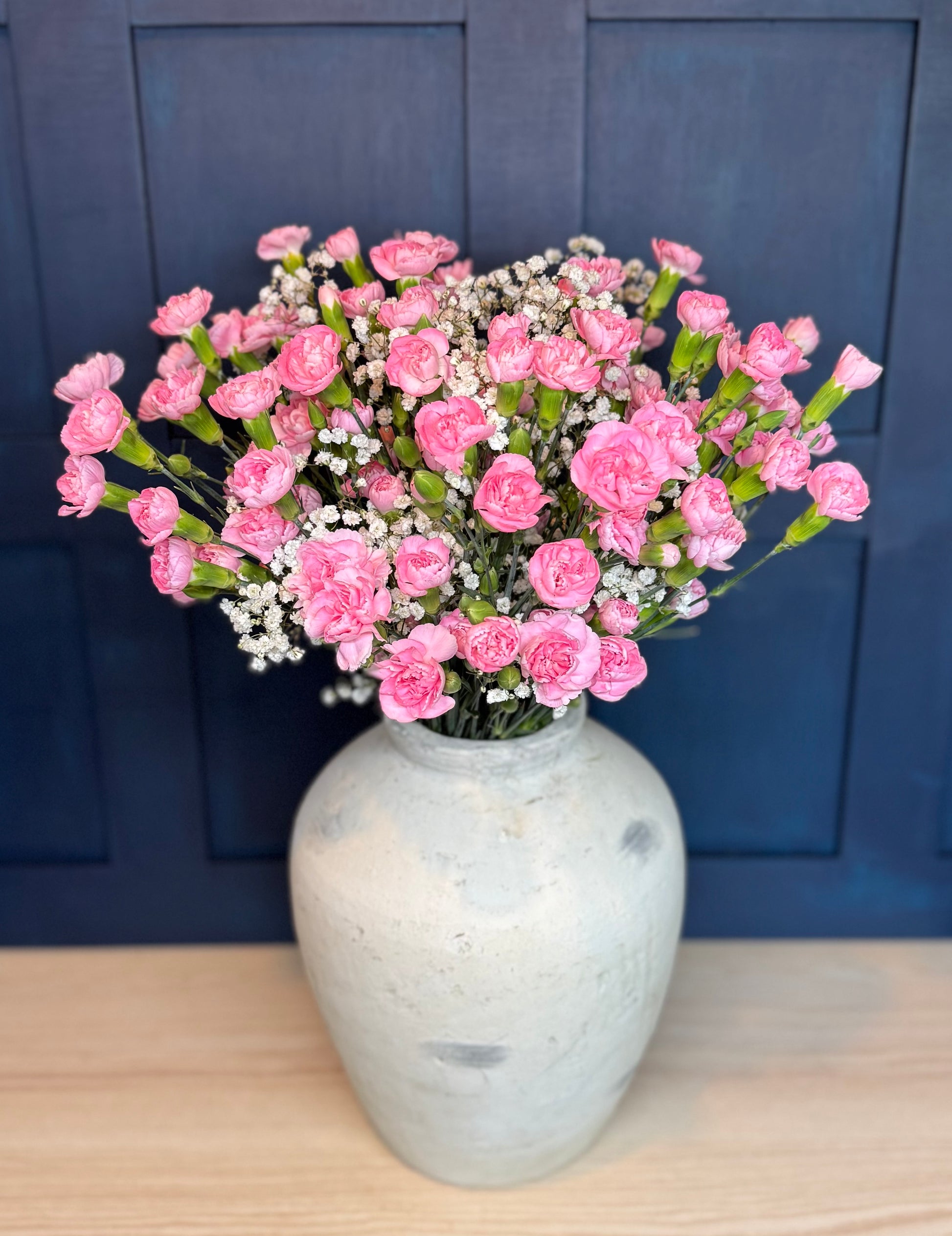 A bouquet showcasing select grade spray carnations combined with delicate Gypsophila, providing a graceful and meaningful gesture to convey your sentiments to a loved one.